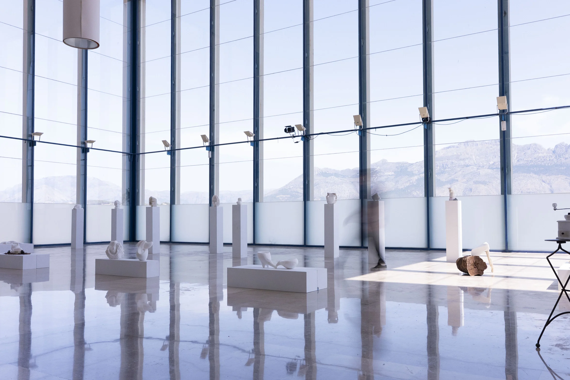 With a 20 m² stage and capacity for up to 200 people, the Mirador Room opens onto the "white village" thanks to its 15 m-high glass walls, offering an incomparable panoramic view of Altea. It functions as an independent room—with its own entrances—or as an ideal complement to the Main Room. Its proximity to the cafeteria makes it the ideal place for presentations, press conferences, professional lunches, or exclusive celebrations.